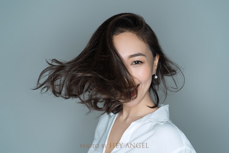 在另外一组拍摄中,我将闪光灯直接安装在相机热靴上,搭配环形的柔光罩,在模特转身的瞬间按下快门,凝固住飞扬的发梢和眼睛中间的环形光斑。