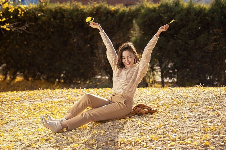 我们继续看一下户外的表现,深秋的北京银杏叶遍布,阳光明媚的下午满眼金灿灿的,逆光可以呈现出漂亮的暖色调,但是问题也显而易见,在没有补光的情况下,还原肤色势必会损失环境氛围,保留环境模特又会一片死黑,而且肤色还会受环境色的干扰,最好的办法是通过人造光线来平衡光比,是闪光灯大显身手的时候了。