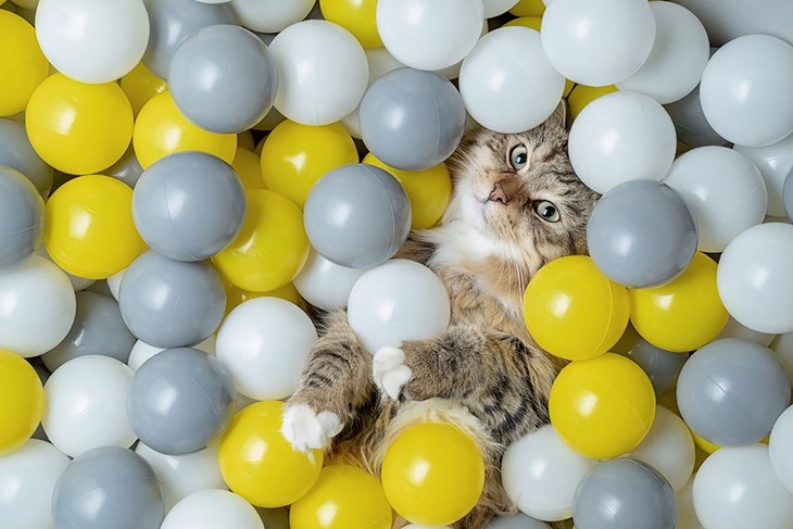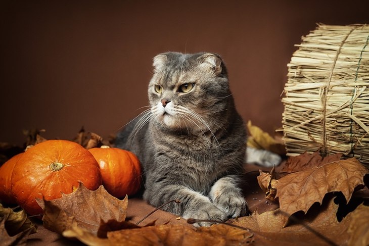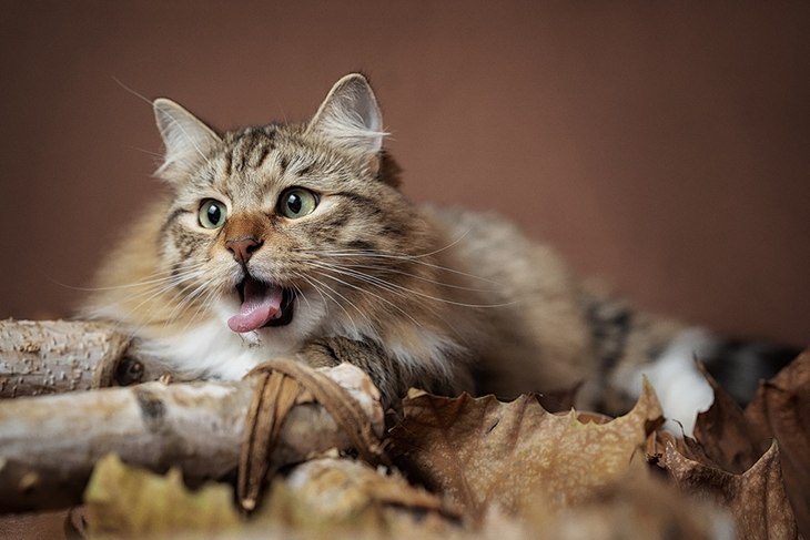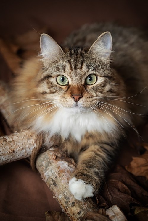 宠物摄影日渐盛行,越来越多的商业摄影师进入该领域成为职业。这组照片虽然是在室内拍摄,但为了呈现更自然的环境,利用干枯的落叶,树干等营造了一个拍摄环境,搭配猫咪的毛色选择了暗调的暖色系,同时为了达到景深效果,选择了较大的光圈值。