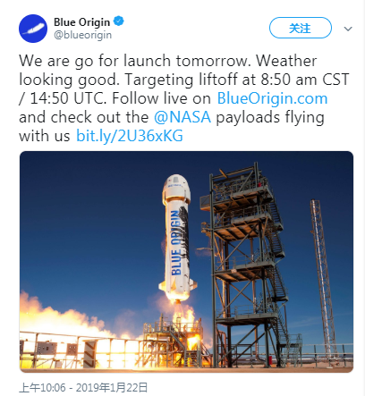 火箭计划于美国中部时间周三早上8点50分从德克萨斯州西部发射。蓝色起源报告说,到目前为止天气预报显示天气很好。整个过程将通过Blue Origin网站直播。这将是New Shepard火箭的第10次任务。